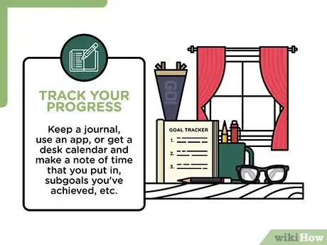 3Track your progress. Once you start working toward your goal, keep track of your progress. Keep a journal, use an app, or get a desk calendar and make a note of time that you put in, subgoals you've achieved, etc.