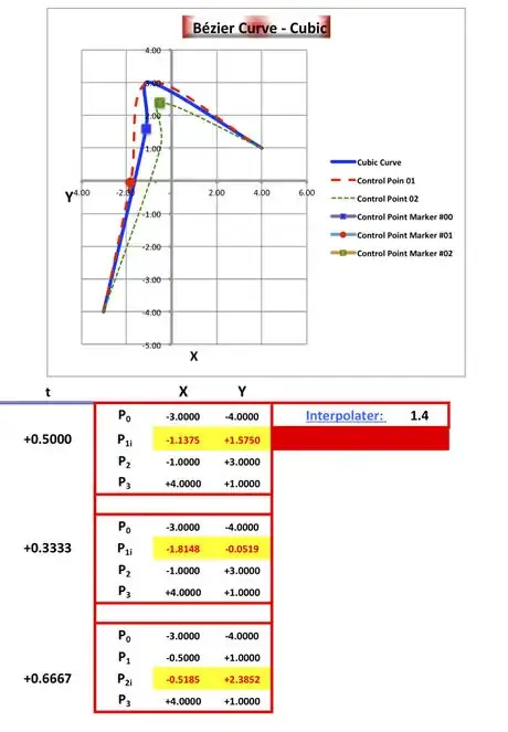 - Enter to cell L72, w/o quotes, the formula "=((1-t)^3*Psub0_Y+3*(1-t)^2*t*Psub1_Y+3*(1-t)*t^2*Psub2_Y+t^3*Psub3_Y)*Interpolater" and Format Cells Font Red [Result=+1.1250]; copy this same formula and paste it to cells L77 and L83 [where the results are -0.0370 and +1.7037, respectively];