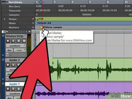 2Crea un marcador. Ubica el punto de tu pista de audio donde quieres agregar un marcador y haz clic directamente sobre él. Presiona la tecla Entrar (Enter) del teclado para que aparezca el cuadro de diálogo Nuevo Punto de Memoria (New Memory Location).