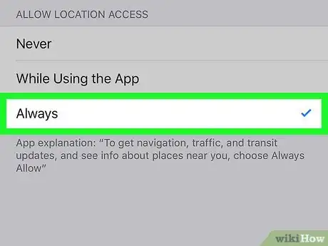 5Selecciona tu preferencia de ubicación. Pulsa Siempre si planeas usar Google Maps para navegación, tráfico, actualizaciones de tránsito y para ver lugares cercanos a ti. Pulsa Al usar la app si solo vas a usar Mapas para buscar direcciones o ubicaciones.[1]Anuncio