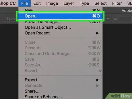 2Haz clic en Abrir. Al abrir Photoshop, verás el botón “Abrir” en la página de inicio. Al hacer clic en él, se abrirá un explorador de archivos que puedes utilizar para explorar y abrir las imágenes en tu Mac.