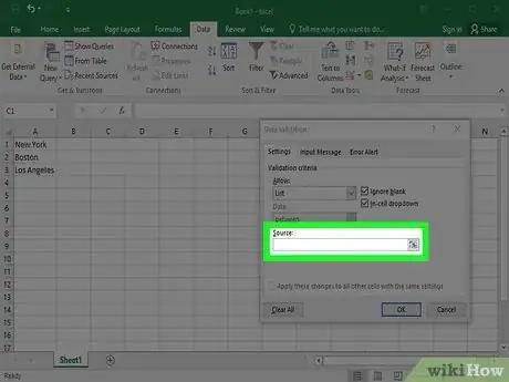 10Haz clic en el cuadro de texto debajo de "Fuente" en el menú emergente. Aquí podrás seleccionar la lista de valores que quieras insertar en la lsita desplegable.