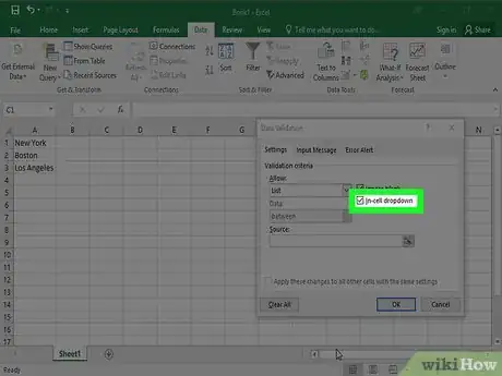 8Haz clic en el botón ACEPTAR en el menú emergente "Validación de datos". Hacerlo creará e insertará la lista emergente en la celda que hayas seleccionado.Anuncio