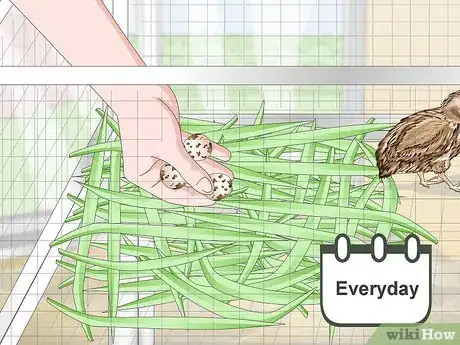 3Dales un suministro constante de agua fresca y limpia. Desecha el agua todos los días y, luego, enjuaga el recipiente antes de volver a llenarlo con agua limpia. Si notas que la codorniz termina su agua antes de tiempo, proporciónale una bebedero más grande o una fuente adicional de agua.