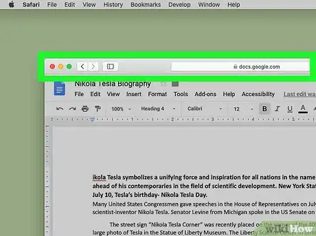4Arrastra el navegador web para que el escritorio sea visible. Si el navegador web está en el modo de pantalla completa, haz clic en el botón verde que está en la esquina superior izquierda para salir de este modo. A continuación, haz clic y mantén presionado un espacio negro en la barra de pestañas de la parte superior del navegador web y arrástralo hacia abajo para que puedas ver el escritorio. También puedes arrastrar el lado izquierdo o derecho para achicar la ventana del navegador web.
