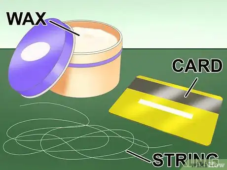 1Consigue los materiales. Este truco funciona mejor con una carta o una tarjeta. Pero también puede realizarse con un billete. Consigue algo de cera o un adhesivo similar, como cinta transparente de doble cara, y una cuerda fina.[1]