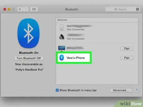 3Busca el nombre de tu iPhone. Después de un momento, debes ver que aparece en la sección “Dispositivos” de la ventana de Bluetooth.