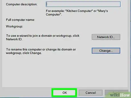 6Cliquea en Cambiar. Encontraras este botón en la esquina inferior derecha de la ventana de Propiedades del Sistema. Esto abrirá una ventana emergente llamada “Cambios del nombre/dominio de la computadora”.