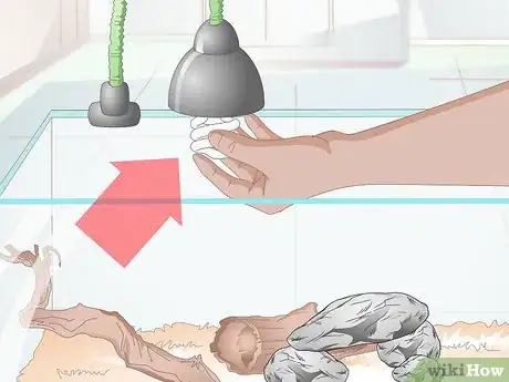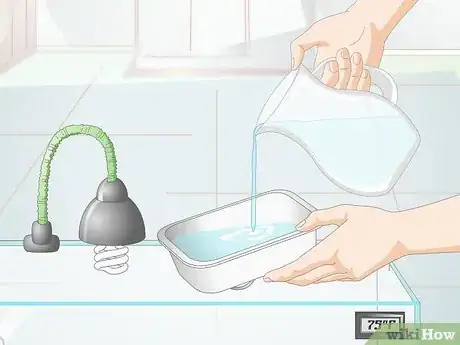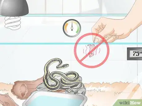 2Installez une source de chaleur. Vous pouvez vous servir d'une compresse chauffante appliquée sur l'un des côtés du terrarium ainsi que d'une ampoule chauffante sur le dessus. Les compresses chauffantes doivent couvrir entre un tiers et la moitié du terrarium. Il doit y avoir un côté de l'espace de vie du serpent plus frais que l'autre. Lorsque vous utilisez une ampoule chauffante, ne dépassez pas 15 watts ou vous allez le faire rôtir. N'utilisez pas de pierres chauffantes. Les couleuvres rayées peuvent se bruler et mourir au contact de ces accessoires. Ne la mettez pas non plus en plein soleil, elle pourrait aussi en mourir.