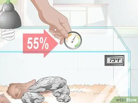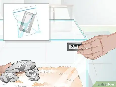 1Achetez un thermomètre. Un thermomètre au mercure n'est pas la solution la plus précise, mais il vous donnera une idée de la température à l'intérieur. Il devrait y faire environ 22 °C dans la partie la plus fraiche et 24 °C dans la partie la plus chaude. Si le terrarium fait plus de 26 °C dans le coin le plus frais, vous savez qu'il y fait trop chaud.