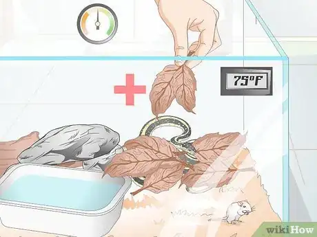 5Laissez-le chasser. Si vous voulez lui donner des aliments vivants (pour qu'il puisse chasser), vous devez créer des cachettes. Posez des feuilles et d'autres objets pour que le serpent puisse s'y cacher et tendre un piège à sa proie. Vous devez retirer les aliments qu'il n'a pas mangés au bout de 24 heures pour éviter la prolifération de bactéries.Publicité