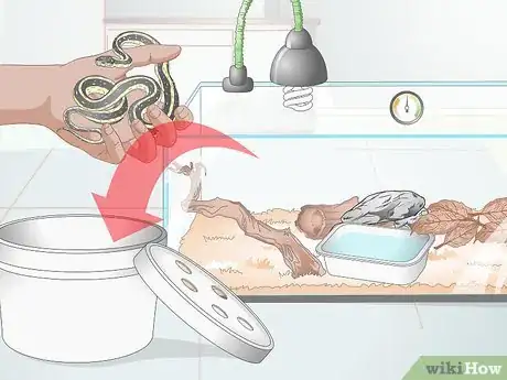 1Nettoyez régulièrement le terrarium. Évidemment, cela ne va pas être l'activité la plus amusante du monde. Pour le nettoyer, vous devez attraper la couleuvre et la mettre dans un récipient un peu plus large que le terrarium (avec des trous sur le dessus) pour sortir tout ce qui se trouve dans le terrarium. Si vous avez mis un substrat à base de copeaux de bois, vous pouvez les jeter et en remettre. Ne mettez jamais de terre, car elle pourrait contenir des parasites.