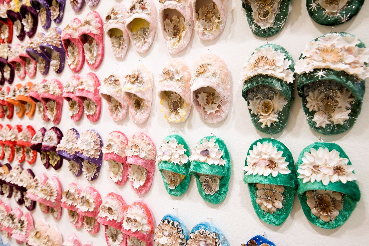 Timbery's piece, Shellworked Slippers (2008) is made up of 200 scuffs embellished with shellwork.[3] The piece is also a memorial to the Stolen Generations.[3] The piece was exhibited at the Sydney Biennale and is in the collection of the Museum of Contemporary Art Australia.[2] Shellworked Slippers also represents the strength of Aboriginal women.[9] Three of her shellworked Sydney Harbour Bridges are part of the collection of the National Museum of Australia.[10] Timbery also has art at the National Gallery of Australia and the Art Gallery of New South Wales.[11]