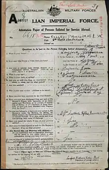 - Enlistment paper. National Archive of Australia: p. 1. Retrieved 23 November 2013.