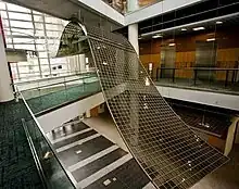 Patterned by Nature was commissioned by the North Carolina Museum of Natural Sciences in Raleigh, North Carolina. This piece was a collaboration between Hypersonic, Sosolimited, and Plebian Design. 10 feet wide and 90 feet in length, this sculptural ribbon winds through a five story atrium of the newly built Nature Research Center museum expansion. "The exhibit celebrates the abstraction of nature's infinite complexity into patterns through the scientific process. It brings to light the similarity of patterns in our universe, across all scales of space and time.", says Bill Washabaugh, one of the project designers. The ribbon is made of 3,600 tiles of individually dimmable LCD glass, and runs on a total of about 75 watts of power.