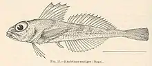 Rastrinus is a monospecific genus of marine ray-finned fish belonging to the family Cottidae, the "typical" sculpins. The only species in the genus is Rastrinus scutiger which is found from the Gulf of Alaska to the Bering Sea in the northeastern Pacific Ocean. It is a deep water species, occurring at depths of from 100 to 740 metres (330 to 2,430 ft), most commonly found at 200 to 300 metres (660 to 980 ft). This species grows to a length of 16 centimetres (6.3 in) total length. [1]