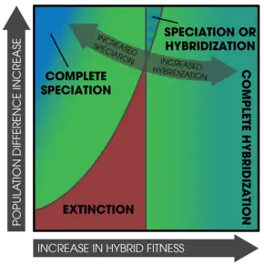 Population densities are an important factor in reinforcement, often in conjunction with extinction.[23] It is possible that, when two species come into secondary contact, one population can become extinct—primarily due to low hybrid fitness accompanied by high population growth rates.[23] Extinction is less likely if the hybrids are inviable instead of infertile, as fertile individuals can still survive long enough to reproduce.[23]