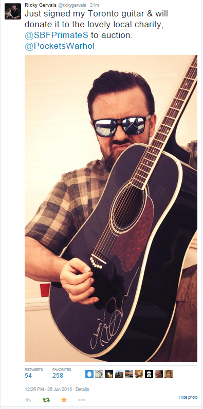 - "Ricky Gervais' guitar raises $6,000 for Ikea monkey's sanctuary | The Star". thestar.com. Archived from the original on 18 July 2018. Retrieved 18 July 2018.