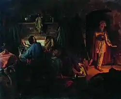 Having written the novella in his dying years, after his excommunication, Tolstoy relishes the chance to unveil the "pseudo-piety and hypocrisy of organized religion." Yet, he maintains an unwavering belief in man's capacity to find truth, so the story remains hopeful, especially in Part II, which shows that good works can affect another as in a domino effect, just as evil does in Part I.[2] The novella has also been translated with the title "The Counterfeit Note" and "The Forged Banknote."[3]