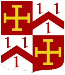 Arms: Quarterly 1st and 4th Gules a cross potent Or 2nd and 3rd Argent a chevron between three crampirons Gules.[2]