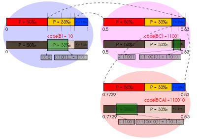 Arithmetic coding (AC) is a form of entropy encoding used in lossless data compression. Normally, a string of characters is represented using a fixed number of bits per character, as in the ASCII code. When a string is converted to arithmetic encoding, frequently used characters will be stored with fewer bits and not-so-frequently occurring characters will be stored with more bits, resulting in fewer bits used in total. Arithmetic coding differs from other forms of entropy encoding, such as Huffman coding, in that rather than separating the input into component symbols and replacing each with a code, arithmetic coding encodes the entire message into a single number, an arbitrary-precision fraction q, where 0.0 ≤ q < 1.0. It represents the current information as a range, defined by two numbers.[1] A recent family of entropy coders called asymmetric numeral systems allows for faster implementations thanks to directly operating on a single natural number representing the current information.[2]