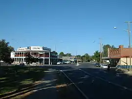 The town was started in the 1860s on the site of the farm. This was where the track for people going to the Lachlan gold fields crossed the Mandagery Creek. A bridge was built over the creek, and then the John Bull Hotel (later the Fat Lamb Hotel) was built next to it. In 1881, the town was laid out and a police station, courthouse and school were built.[4] The creek has flooded many times; in 2005 it had a flood peak of 9 m (30 ft). This cut the town in two, and water flowed through many buildings and houses.[5]