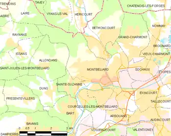 The commune of Montbéliard has an area of 15.0 km2 (5.8 sq mi).[2] Its average altitude is 383 m (1,257 ft); at the city hall, the altitude is 330 m (1,080 ft).[3]