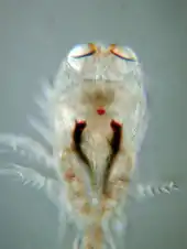 Copepods vary considerably, but are typically 1 to 2 mm (1⁄32 to 3⁄32 in) long, with a teardrop-shaped body and large antennae. Like other crustaceans, they have an armoured exoskeleton, but they are so small that in most species, this thin armour and the entire body is almost totally transparent. Some polar copepods reach 1 cm (1⁄2 in). Most copepods have a single median compound eye, usually bright red and in the centre of the transparent head. Subterranean species may be eyeless, and members of the genera Copilia and Corycaeus possess two eyes, each of which has a large anterior cuticular lens paired with a posterior internal lens to form a telescope.[5][6][7] Like other crustaceans, copepods possess two pairs of antennae; the first pair is often long and conspicuous.