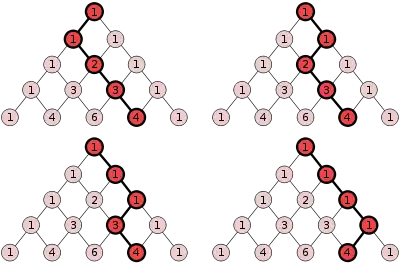 Pascal's triangle overlaid on a grid gives the number of distinct paths to each square, assuming only rightward and downward movements are considered.