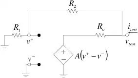 To calculate the output impedance of a circuit such as the inverting amplifier configuration, suppress the input voltage, apply a test voltage to the output, and calculate the output current. Taking the ratio of test voltage divided by output current gives the output resistance. The circuit arrangement is shown in the figure below.
