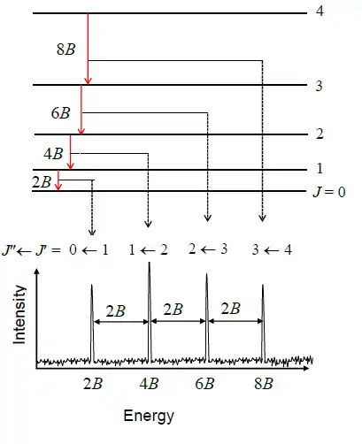 As a result of the equations in the box above, you get a series of spectral lines, each separated by 2B.