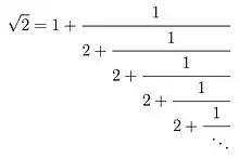 - (mathematics, number theory) A compound numerical expression consisting of an integer plus a fraction whose numerator is a positive integer and whose denominator is a continued fraction (an integer plus a fraction), and so on, with finite or infinite recursion.