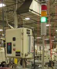 - A column of color-coded electric lights, used to indicate the status of a machine or process.