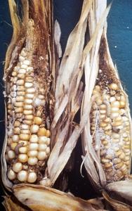 Grains damaged by pests such as stemborers become susceptible to infection by mouldy fungi such as Aspergillus - see photo on the right side - which produce aflatoxin, a toxic by-product extremely poisonous to people and which can lead to liver cancer.