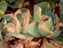 The plant can be infected at any time during its life cycle. On young seedlings a yellowing appears along the margin of the cotyledons, which later shrivels and drops off. On the margins of mature leaves, similar yellowing appears. Initially, a small V-shaped area develops, but as the diseased area enlarges, the veins become distinctly black. In contrast to Fusarium yellows the veins are brownish in colour. The affected stem, when cut crosswise, shows a characteristic black ring. In later stages the entire head may turn black and soft due to secondary infection by soft rot bacteria (Erwinia carotovora var.carotovora).