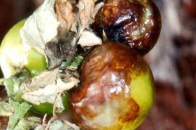 The late blight fungus affects tomatos, potatoes and eggplants but not pepper. Its symptoms consist of brown spots with purplish tinge and they can develop on leaves, stems, branches and both green and ripe fruits. In moist weather it can cause complete defoliation and rotting of fruits.