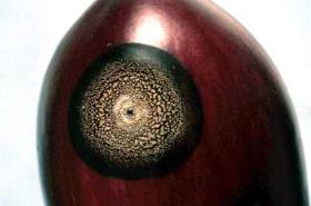 Several Alternaria spp. are involved. These include A. melongenae, A. solani and A. tenuis. They cause leaf spotting and fruit rots. They produce leaf spots with concentric rings. The spots are mostly irregular, 4 to 8 mm in diameter and may enlarge and cover a large area of the leaf blade. Severely infected leaves drop off prematurely resulting in the reduction of yield. Fruit spots are circular, brown, dry and hard.