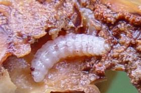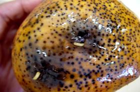Maggots of fruit fly dropping out of mango fruit to pupate. © A. M. Varela, icipe. |