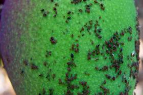 It is small (1.1 to 2.5 mm long), brown, black or reddish brown aphid covered with a light powdery dusting. Aphids live in clusters sucking sap on the underside of young leaves, on petioles, young branches and fruit. Their feeding causes slight rolling, or twisting of the leaf midrib. Sooty mould growing on honeydew produced by the aphids may cover leaves, twigs and fruit. Coating of the fruit with honeydew and sooty mould reduces its market value.