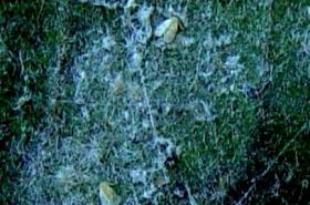 The mango leafcoating mite is tiny (about 0.2 mm), light coloured and cigar shaped. It cannot be seen with the naked eye. The mites leave in groups under a white coating on the upper leaf surface. The white coating can be easily rubbed off by hand. Leaves covered with the white coating tend to turn yellow and drop prematurely. In general, the coating has minimal effect on fruit yield.