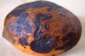 Anthracnose, caused by the fungus Colletotrichum gloeosporioides, is the most wide-spread disease among mangoes. The varieties vary in susceptibility. Colletotrichum gloeosporioides causes anthracnose on fruits, and drop of flowers on young branches. Anthracnose always appears as a result of scurvy (Elsinoe mangiferae). Fruits stricken with anthracnose can be plunged into a hot water bath (3- 5 min. at 55°C), in order to kill off the fungus. Preventative measures are nevertheless preferable, to preclude injuries and an infection with scurvy, because anthracnose can usually only take a hold on damaged fruits that are also affected by scurvy. A case of scurvy can usually be prevented by removing all dead plant material (branches, leaves and fruit). In exceptional cases, the fungus can be brought under control again with copper strays.