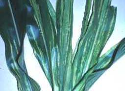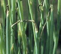 It attacks young plants, appearing as white specks, usually confined to the oldest leaves of young plants. A greyish white mould develops rapidly in cool damp weather and progresses down the sheath, and plants eventually fall over and dry up. Optimum temperatures for fungal growth are between 13 and 20° C. Because of the temperature requirements of the fungus, the disease is more serious in higher cooler areas.