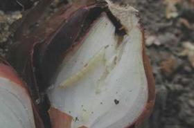 The larvae of the onion fly, also called onion maggot is a major pest of onions. The maggot is small (about 8 mm in size when fully grown), white-cream coloured. It eats the lateral roots, then tunnels into the taproot and sometimes bores into the base of the stem. Attacked leaves wilt and the leaves turn bluish. The plants become shrivelled or eventually die. The maggots feed just above the base of seedlings killing them. A maggot can attack several seedlings in succession. This causes poor plant establishment resulting in many gaps in the field.