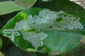 The citrus leafminer (Phyllocnistis citrella) The caterpillar of the citrus leafminer usually attacks young leaves and shoots. It mines the undersurface of young leaves, but it can attack both leaf surfaces, in heavy infestations, and occasionally the fruit. Its feeding causes serpentine mines that have a silvery appearance and reach a length of 5 to 10 cm. The middle of the mines is marked by a light or a dark coloured stripe, which consists of the excreta of the caterpillars. The caterpillars are greenish yellowish and are to 4 mm in length. Caterpillars pupate within the mine, near the leaf margin, under a slight curl of the leaf. The moths are tiny (2 to 3 mm long), greyish white in colour with fringed wings.