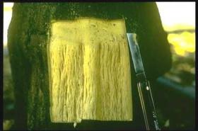 | Copper | Deep green, oversized, then darkened | Splitting and gumming. Dark brown gum soaked eruptions. May turn black. Gum in centre core |