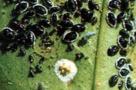 Citrus aphids (Toxoptera citridus and T. aurantii) They are small (1 to 3mm in length), brown to black in colour, and may be winged (having 2 pair of wings) or wingless. They feed by sucking on new growth and blossoms. High numbers are found on the leaf surfaces during the period of flushing (production of new shoots) and stems of attacked young shoots die back. Attacked leaves are curled and distorted. Flower buds are damaged or drop. Aphids excrete large amounts of honeydew. Leaves and fruits may turn black due to the growth of sooty mould. Symptoms can be severe on flush growth during dry periods following rainy spells. | ![]()