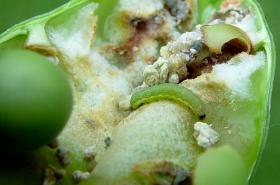 It is characterised by a rot at the base of the plant stem. The rot is covered by a cottony, fungal (mycelial) growth on which black irregularly shaped fungal bodies (sclerotia) are produced. Size of sclerotia varies from 2 to 22 mm in diameter. The disease infects the stem and pods. Large, black, round to irregularly-shaped sclerotia of varying size form on stems, which are partially covered with dense white mycelium. Sclerotia are also formed in the stem pith and are conspicuous when the stem is opened. Seeds may become infected within diseased pods. If infected early, seeds are flattened and shrivelled and sometimes replaced by black sclerotia. Attacked plants die prematurely, sometimes before seeds have formed. Infection occurs at flowering. Moderate air temperatures and frequent rains just prior to flowering to the pod development stage of growth favour the disease.