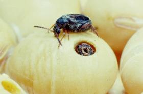 Larva of storage moths (Ephestia cautella, Corcyra cephalonica) and bruchid beetles (Callosobruchus spp.) cause extensive damage to soybean grains.