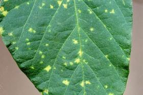 Leaves of infected plants are not distorted as in SMV. The younger leaves show a yellow mottling scattered in random areas over the leaflets or sometimes an indefinite yellow band along major veins. Rusty necrotic spots develop in the yellowed areas as the leaves mature. Infected plants are not noticeably stunted. The disease is transmitted by aphids and infected seeds.