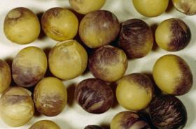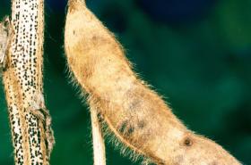 The two species of fungi produce similar symptoms on the petioles, stems and pods particularly when plants are nearing maturity. Diseased areas have dark sunken lesions. Under moist weather the lesions become covered with a pink spore mass. The disease is seed-borne. When infected soybean seeds are planted, many of the seeds rot in the soil. Those that emerge from the soil often have brown, sunken cankers on the cotyledons (seedling leaves). The fungi may grow from them into the young stems. The damping-off seedling losses are probably more serious phases of soybean anthracnose than symptoms on older plants. The disease is favoured by cool wet weather.